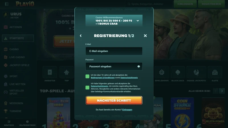 Starten Sie, indem Sie auswählen, wie Sie beitreten möchten: Casino-Willkommensangebot, Sport-Ersteinzahlungsangebot oder kein Bonus. Sie können auch einen Promo-Code eingeben, wenn Sie einen haben, und sehen vor der Bestätigung eine kurze Vorschau der wichtigsten Bedingungen. Unser Casino-Willkommenspaket beträgt 100% bis zu 500 EUR plus 200 Freispiele bei einer Mindesteinzahlung von 20 EUR. Wenn Sie wegen eines PlayIo Casino Bonus ohne Einzahlung gekommen sind, beachten Sie bitte, dass diese Art von Angebot aktuell nicht in unseren Willkommensoptionen aufgeführt ist.
